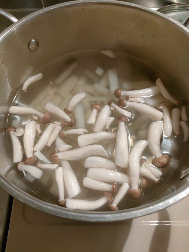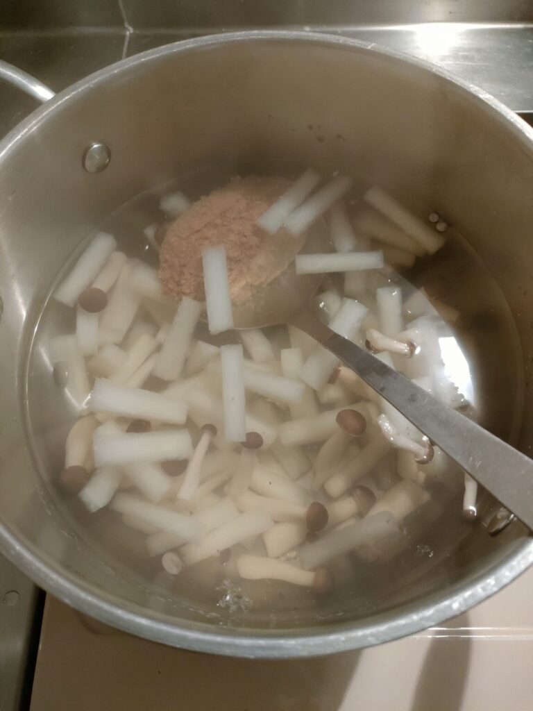 大根に火が通ったら、しめじや薄揚げなどを加えます。