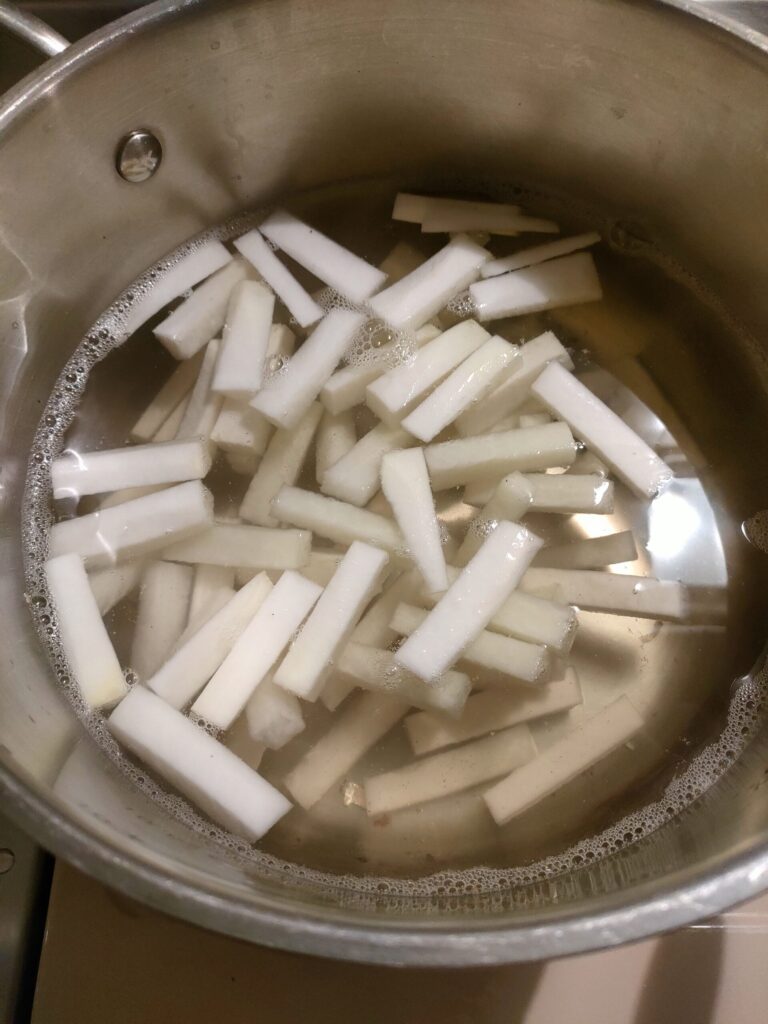 出汁と大根を鍋に入れ、やわらかくなるまで5〜7分ほど煮ます。