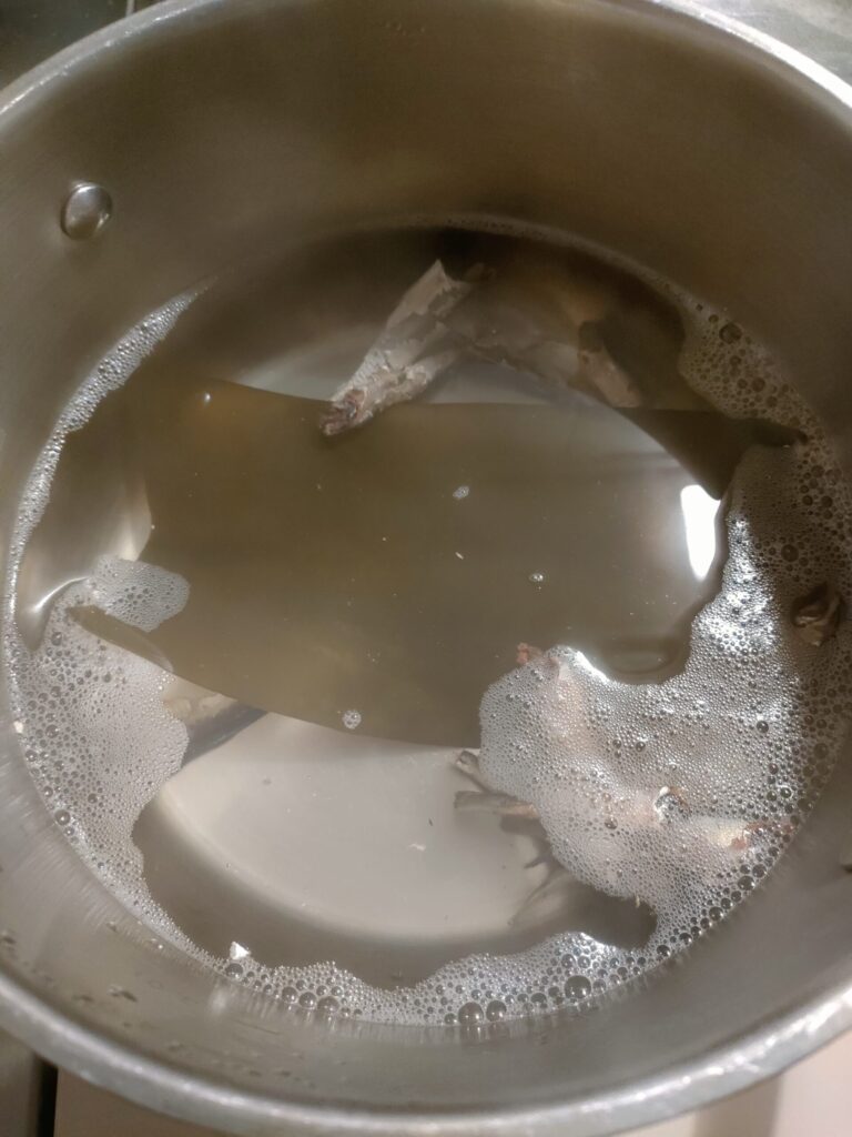 昆布と煮干しを取り出したところ。これで出汁の完成です